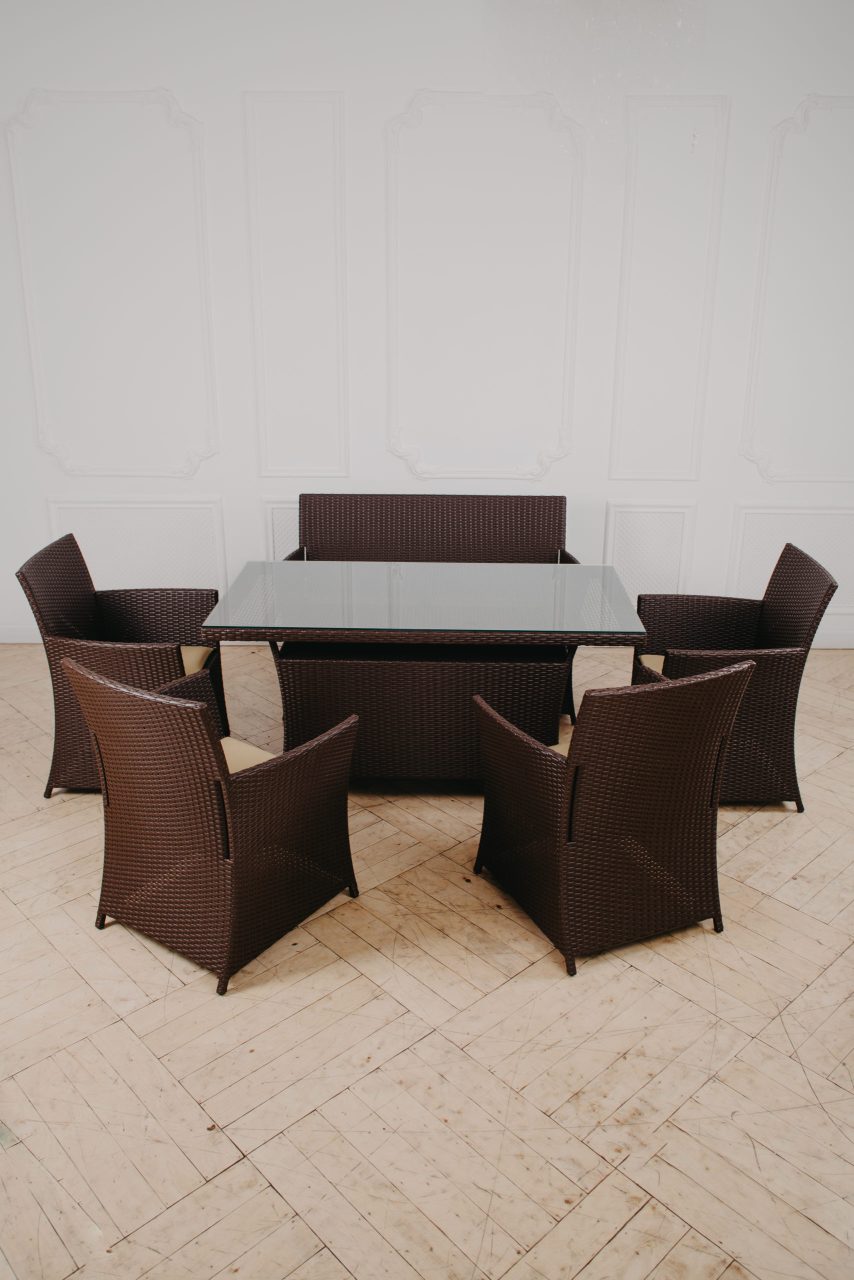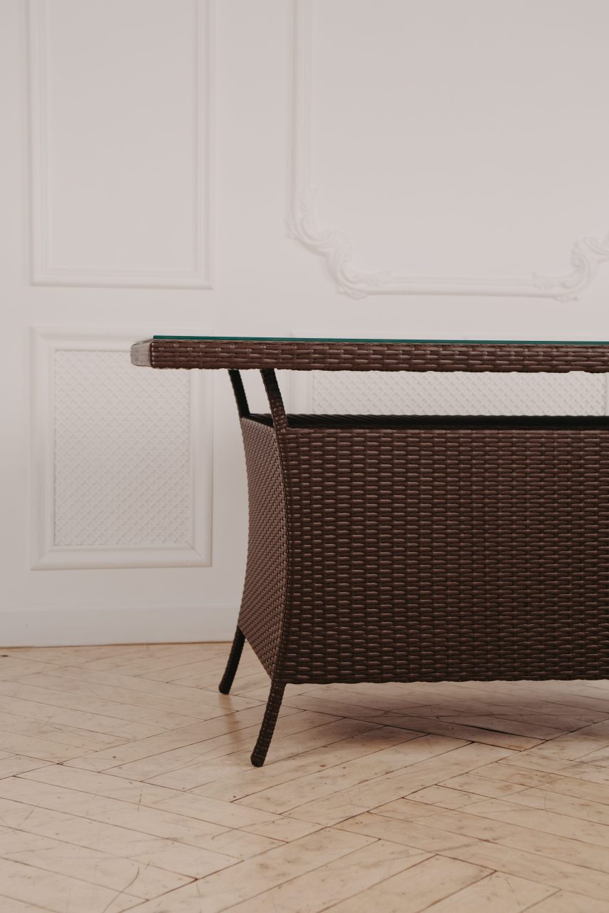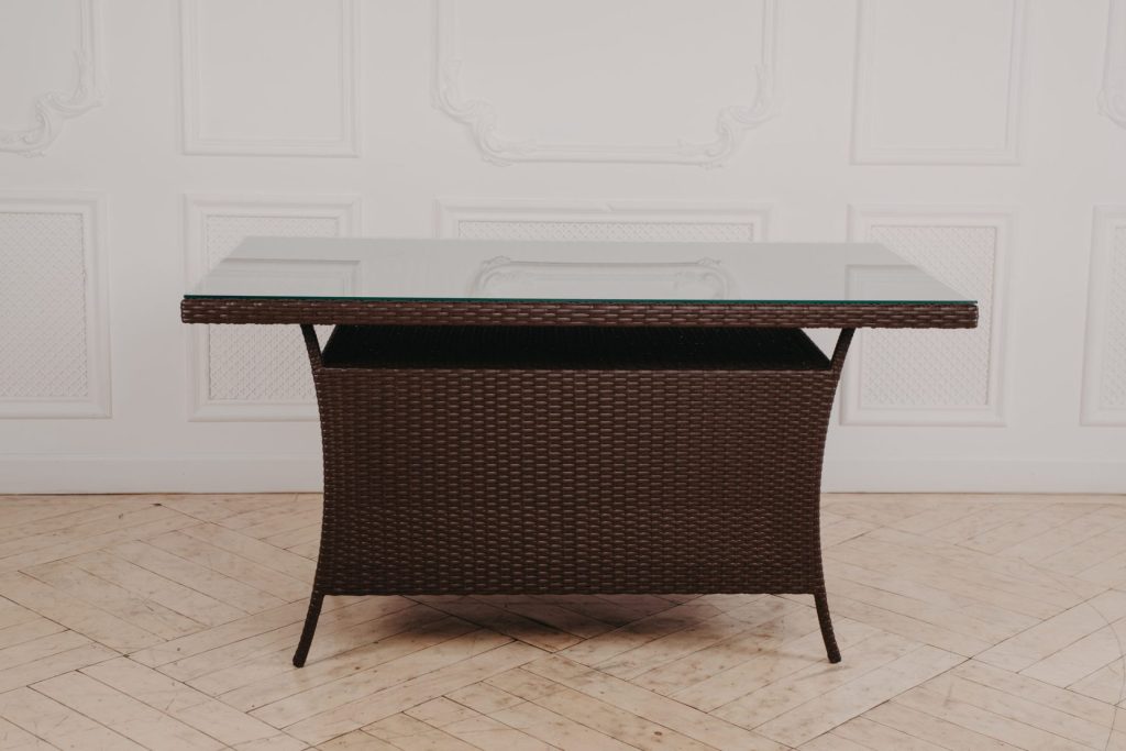 Металлический каркас, материал плетения — искусственный ротанг. Столешница – стекло 8 мм.