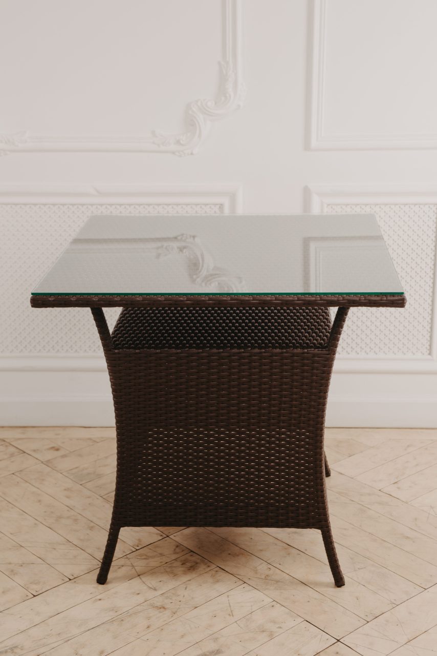 Квадратный стол со стеклянной столешницей.