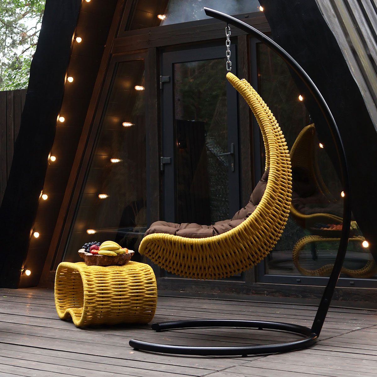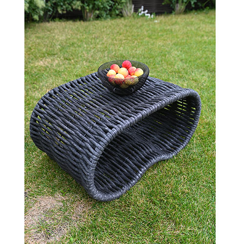 Стол-пуф из полимерной лозы можно использовать в качестве невысокого столика или пуфа, кроме того он идеально сочетает с креслом-коконом, в качестве подставки под ноги.